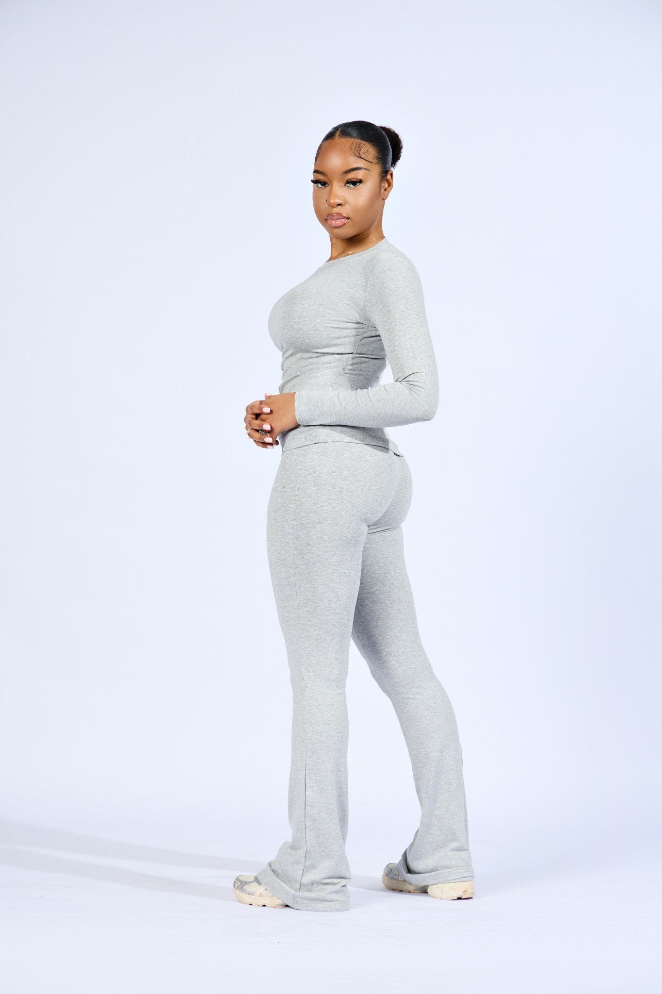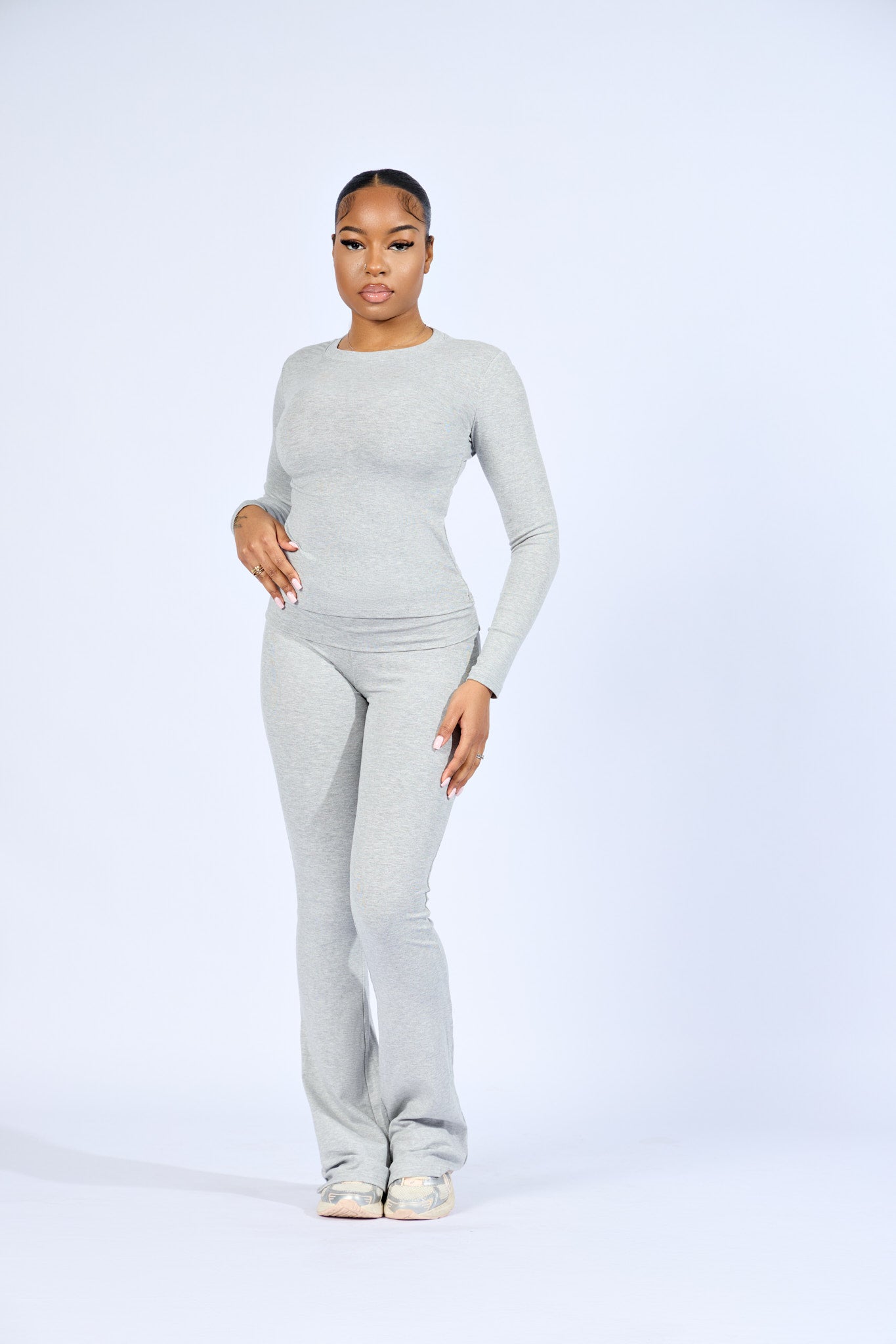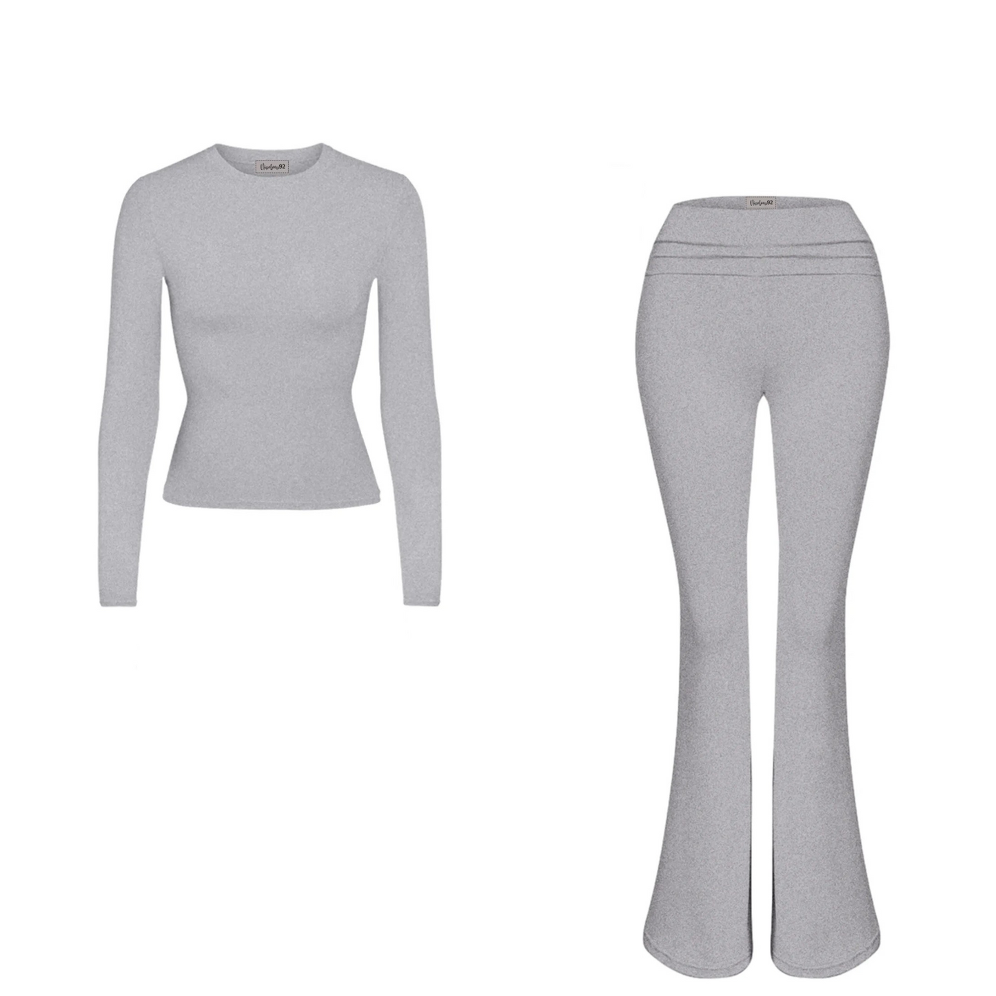Wrap yourself in effortless luxury with our Micro Ribbed Long Sleeve Set. Designed with a flattering slim fit and crafted from ultra-soft, stretch micro-ribbed fabric. Features include a sleek crew neckline, contouring ribbed texture, and a mid rise waist flared bottoms.